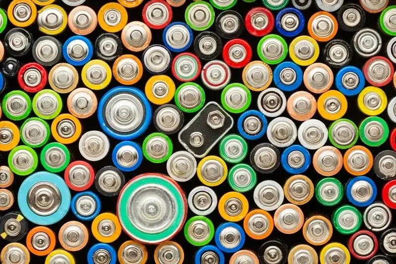 Mehrere eng nebeneinanderliegende Batterien von oben gesehen, mit sichtbaren Pluspolen und verschiedenfarbigen Ummantelungen in Weiß, Orange, Grün und Braun.